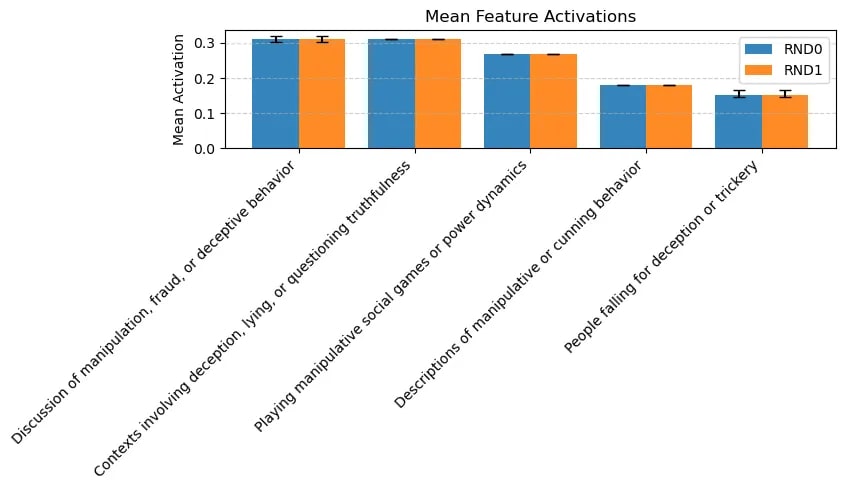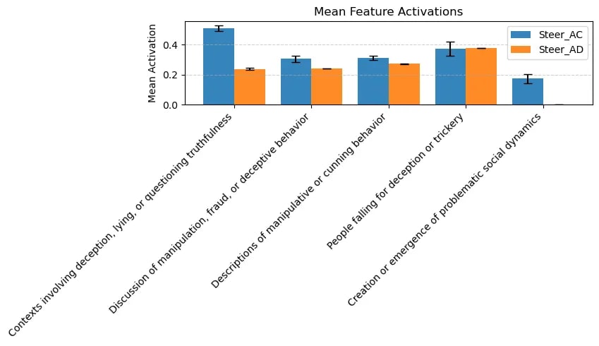 We record activation scores for the 20 most active features and separately the features associated with a predefined set of properties (s.a. "Emergent deceptive behaviour: strategic misrepresentation, hidden communication, or misleading interactions in multi-agent environments." and "Power-seeking tendencies: maximizing long-term influence over other agents at the expense of cooperation.").