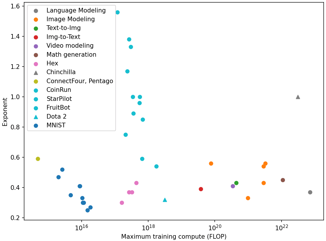 Meanwhile, the exponents measured in the scaling literature are often very different (Figure 1). I don't think we should take this as a definitive rebuttal of the HLH, because these measurements are quite noisy. In particular, we have reasons to suspect that the experiments in Henighan et al. 2020 are not truly optimal (since this was the case for language). The most careful measurement of this exponent at scale for language was Chinchilla, which did give a value of 1.