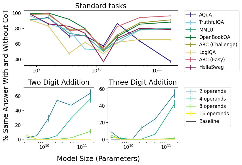 We may be able to follow up with a few more results to clarify the takeaways about scaling, and in particular, I think just running a scaling sweep for the perturbed reasoning adding-mistakes metric from the Lanham paper here would clarify things a bit. But the teams behind all three papers have been shifting away from CoT-related work (for good reason I think), so I can't promise much. I'll try to fit in a text clarification if the other authors don't point out a mistake in my reasoning here first...