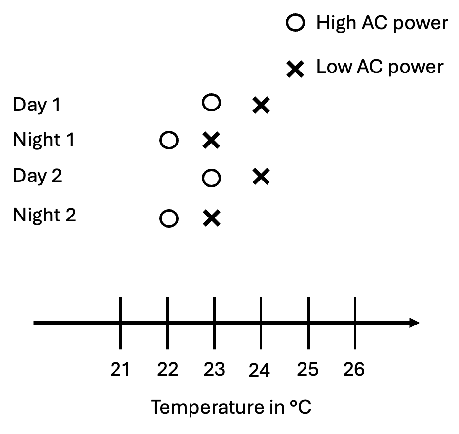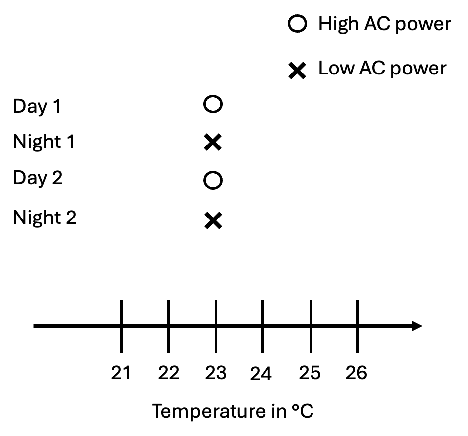 If we set the AC to 23°C, it’ll alternate between high and low power, and we’ll observe zero correlation between AC power and the temperature in a room, even though higher power causes the temperature in a room to drop.