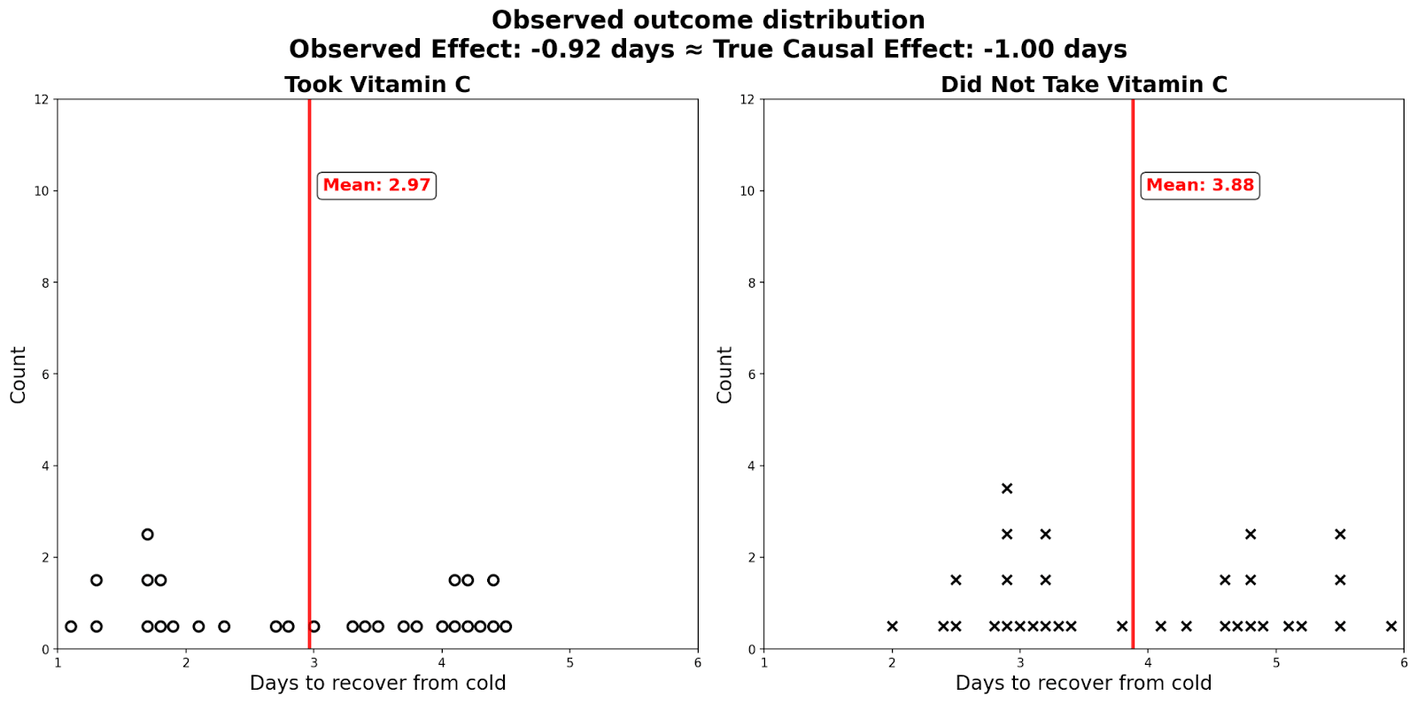 According to the observed data, those who had vitamin C actually took one day longer to recover from the cold! The correlation between taking the pill actually has the opposite sign as the causal effect. Let’s take a look at the previous graphic again, but this time with the unobserved potential outcomes in grey: