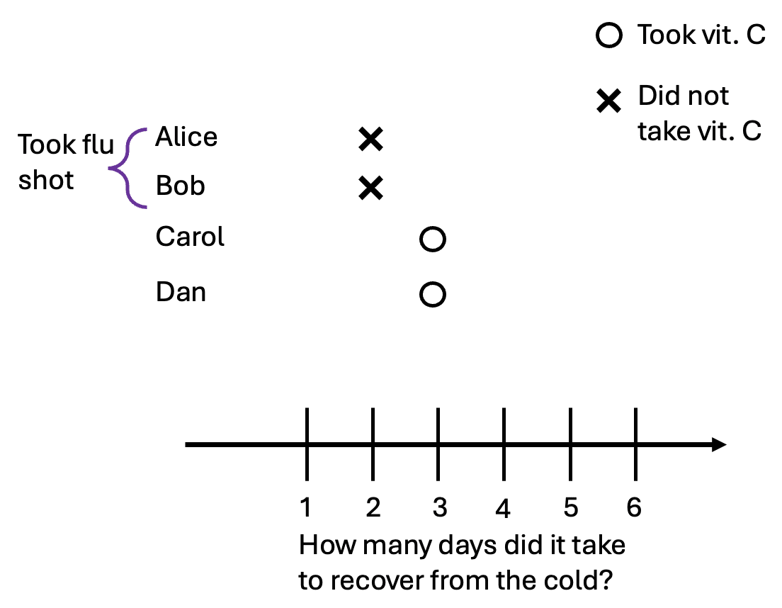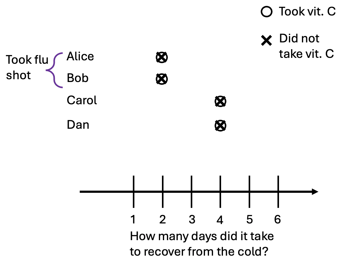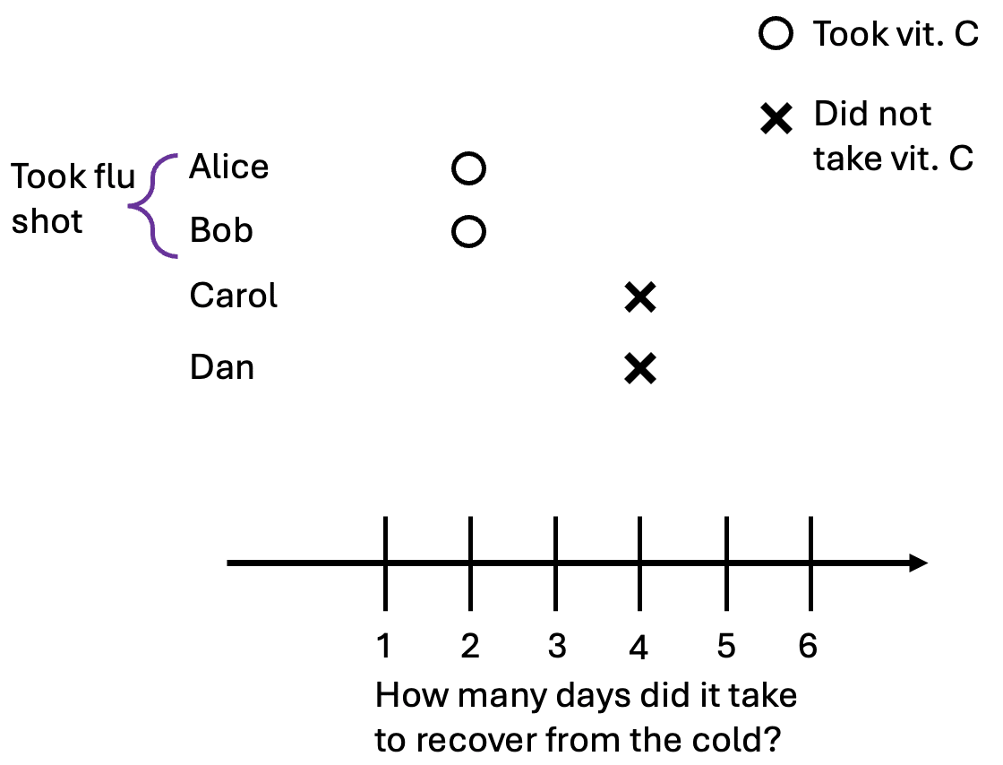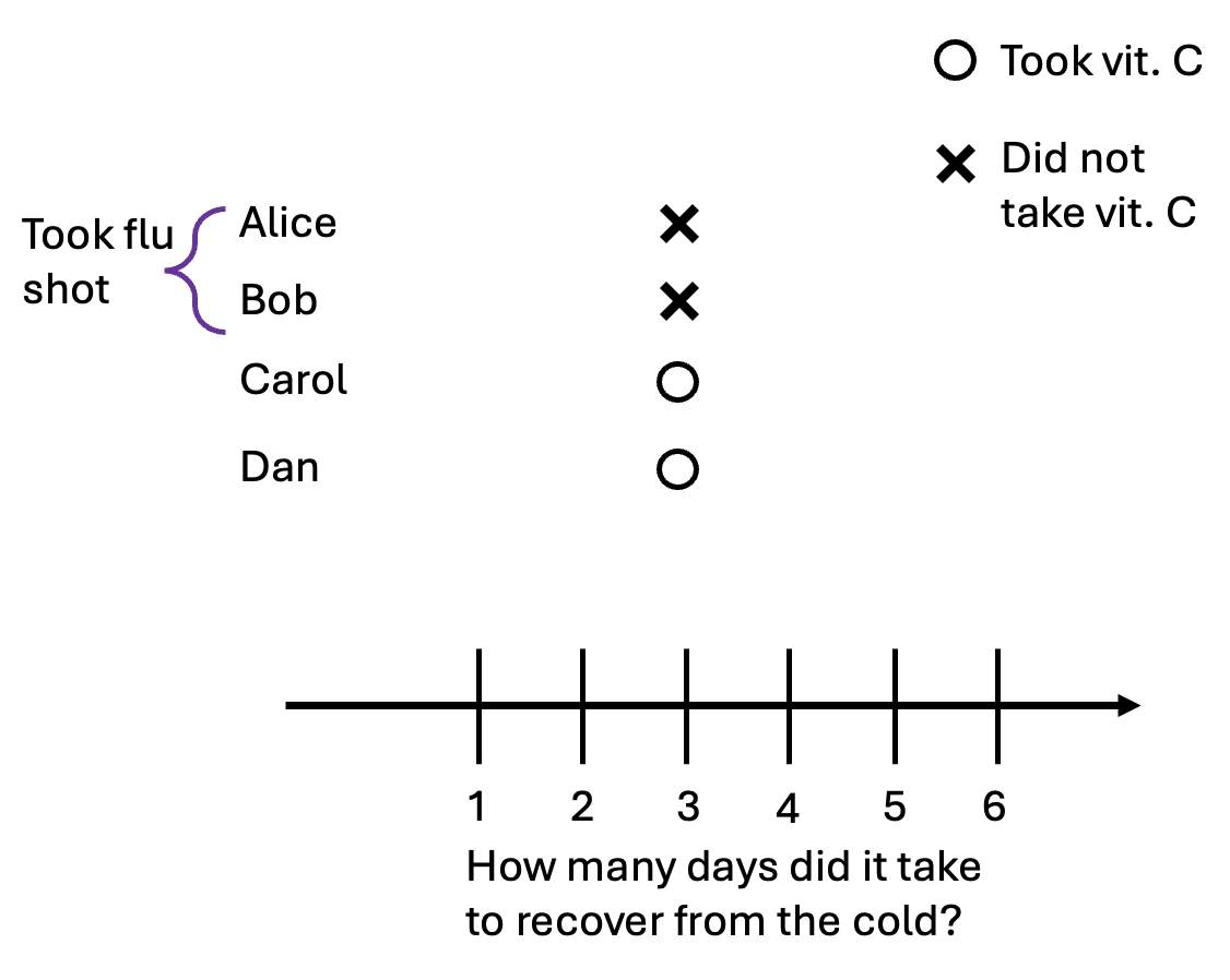We’ll start by showing an example of correlation without causation. Suppose that vitamin C pills have no effect on how long someone’s cold lasts. o and x are in the same place. We’ll still have Alice and Bob take the flu shot. Here are all of the potential outcomes: