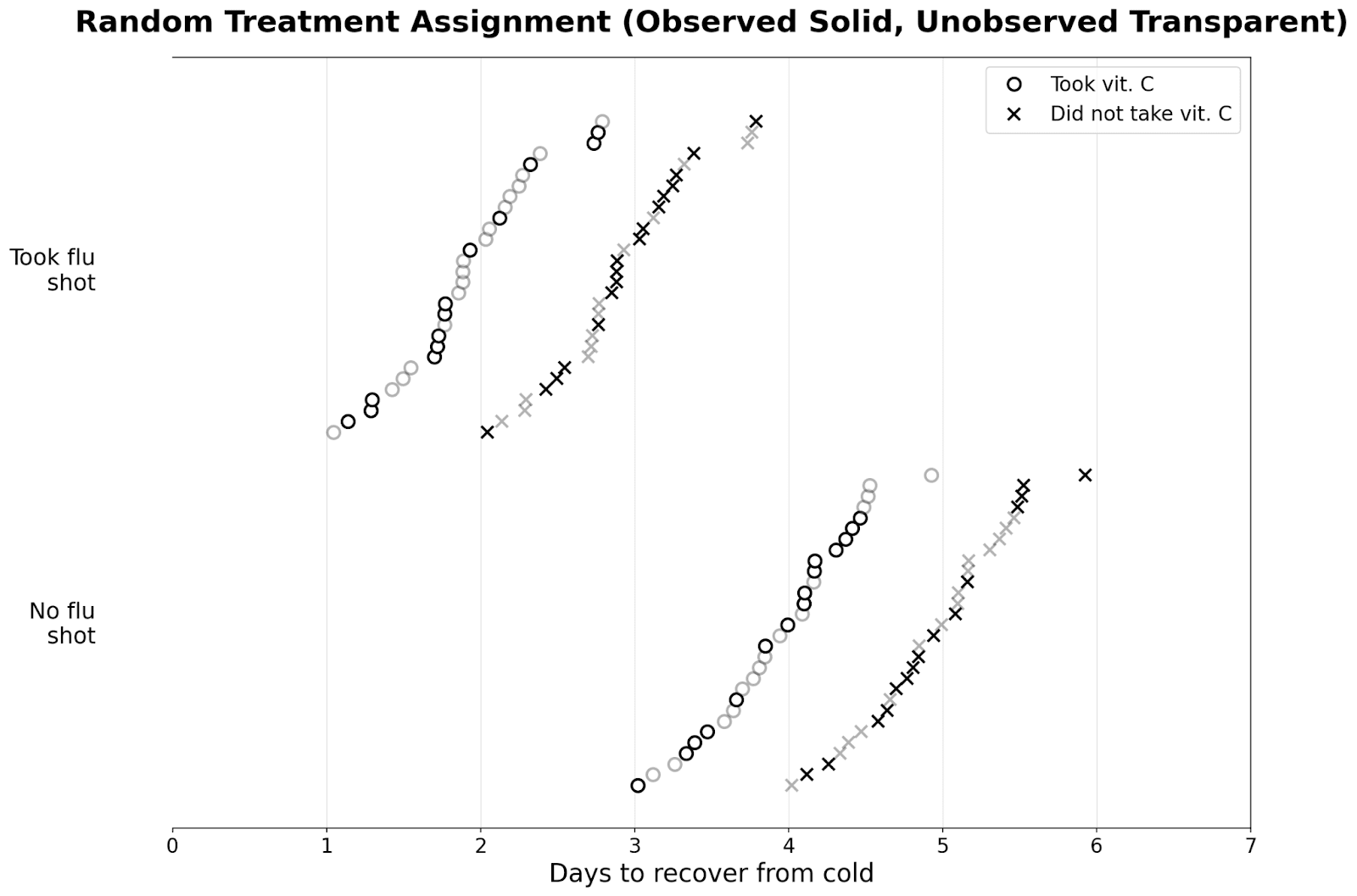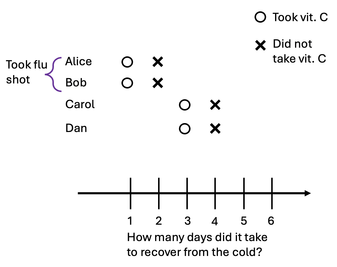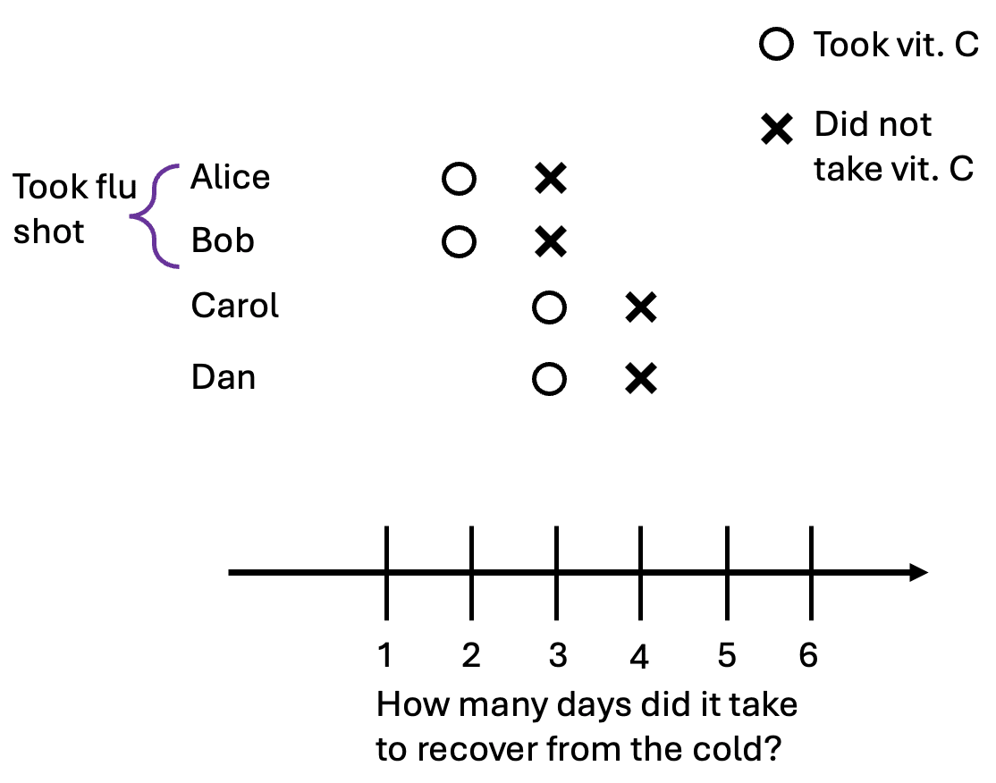 We’ll start by showing an example of correlation without causation. Suppose that vitamin C pills have no effect on how long someone’s cold lasts. o and x are in the same place. We’ll still have Alice and Bob take the flu shot. Here are all of the potential outcomes: