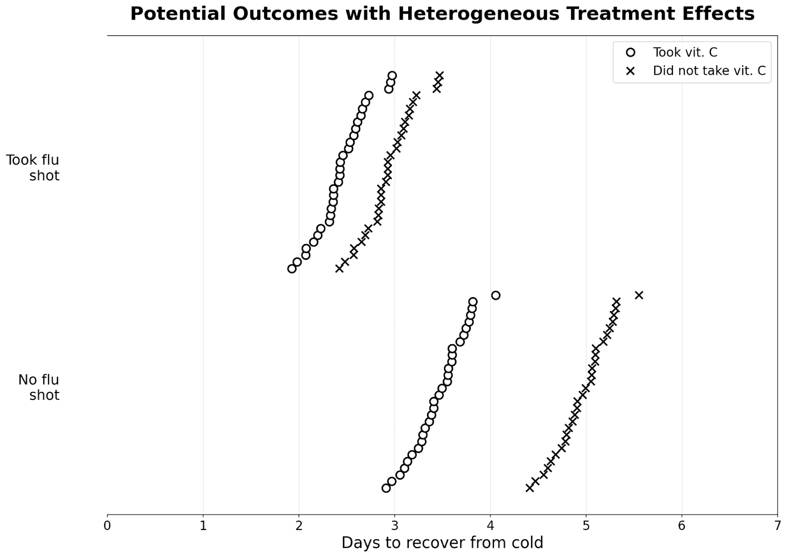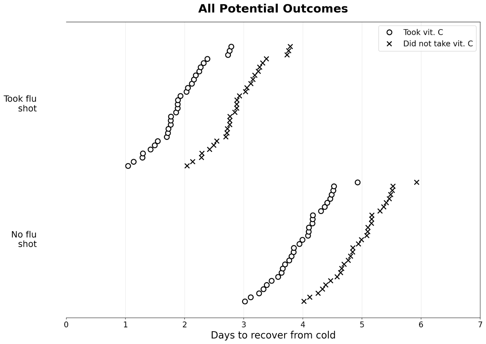 Suppose we have many people who got a cold; some took a flu shot, and some didn’t. Below are their potential outcomes: (I’ve added some noise so they all take slightly different amounts of time to recover)