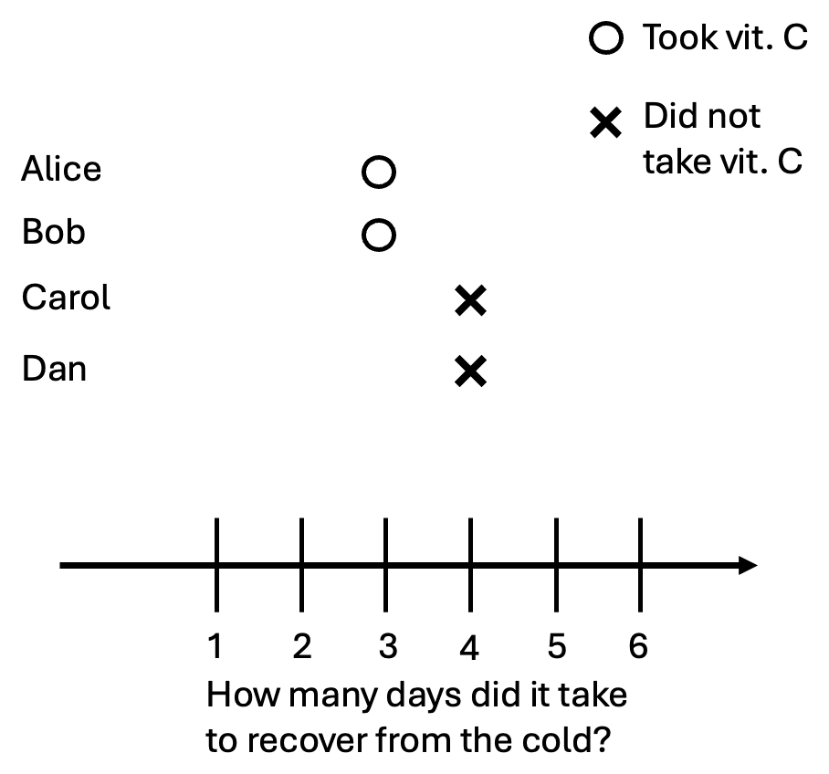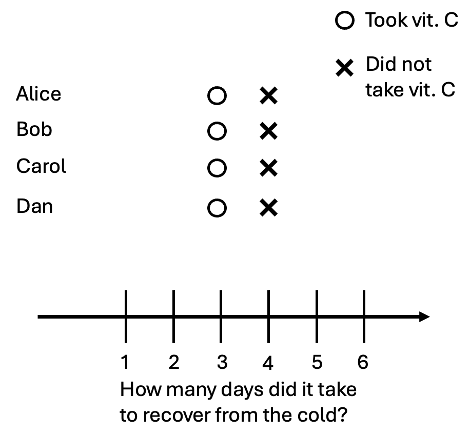 Let’s now consider four people who all got the cold: Alice, Bob, Carol, and Dan. In this scenario, they are all identical: they will recover in three days if they take vitamin C, and recover in four days if they don’t: