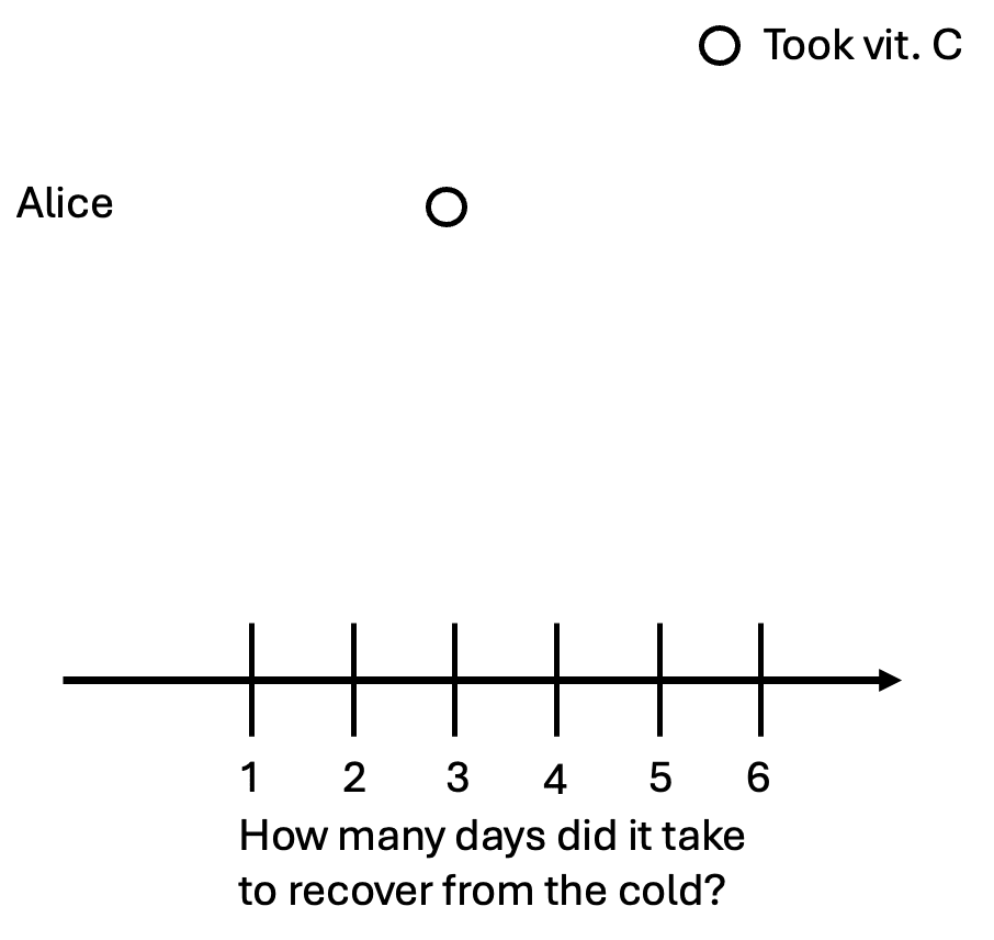 Suppose Alice just caught a cold. She read online that taking vitamin C might reduce the time it takes for her to recover,[1] so she takes a vitamin C pill and feels better after three days. We’ll denote this as a circle on the graph:
