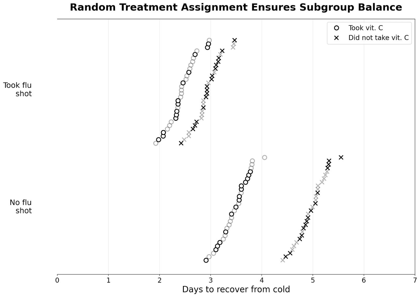 The fundamental problem in causal inference is that we can never observe more than one potential outcome for every unit, yet the value we’re trying to find–the causal effect–is defined in terms of the difference in potential outcomes. If we randomize who receives the vitamin C pill in a large sample, then the people who got the flu shot and those who didn't will be distributed roughly evenly across the "treatment" and "control" groups. As a result, the two groups become comparable.