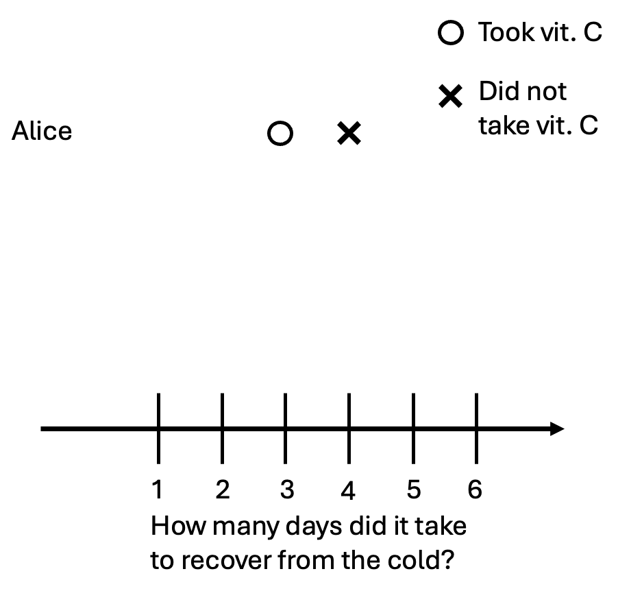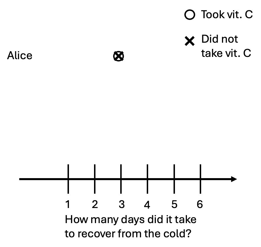 Is this enough to tell if vitamin C helped Alice get better? No. We need to know how long it would’ve taken Alice to recover if she had not taken vitamin C. Suppose that vitamin C works: it would’ve taken Alice four days to recover without the pill. We can denote that as an x on the graph.