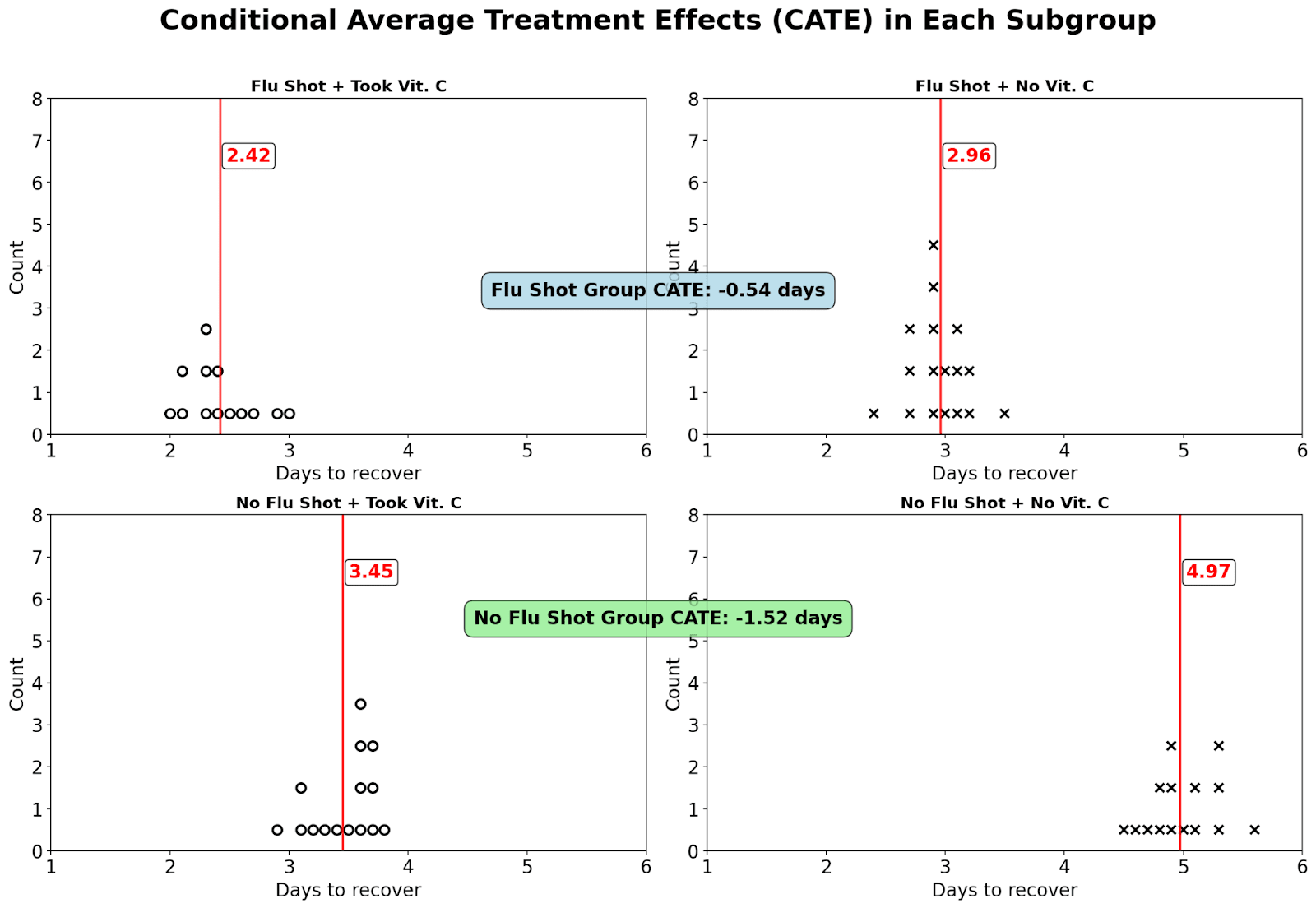Instead of calculating the average treatment effect by computing the mean days it takes to recover from the cold for those who took the pill and the mean for those who didn’t, we calculate the mean separately for those who took the flu shot and those who didn’t. This gives us the conditional average treatment effect or CATE, which is different from the average treatment effect (ATE) for everyone.