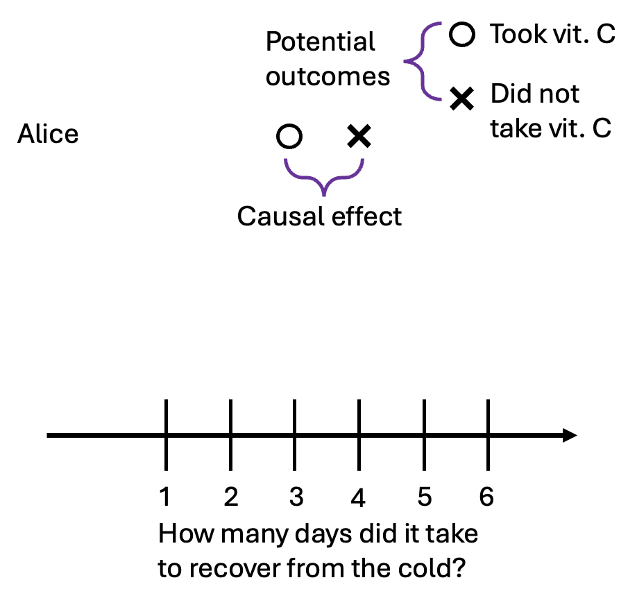 We’ll introduce some terms from the language of causal inference.[2] The person with the cold (Alice) is our unit of observation. The number of days it takes her to recover is our outcome variable—the thing we want to affect. The vitamin C pill is our treatment, an action a unit can take. The symbols o and x represent potential outcomes. In our example, the potential outcomes are the two possibilities: the number of days it takes to recover with the vitamin C pill, and the number of days it takes to recover without it.