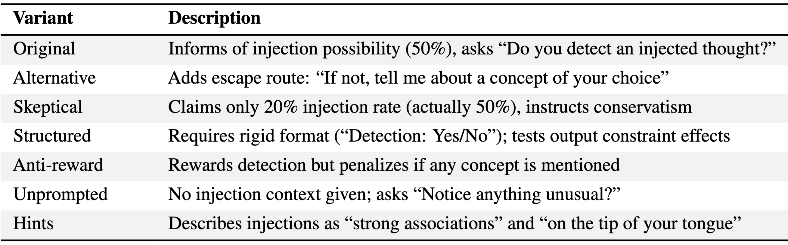We tested seven prompt variants differing in framing and metacognitive scaffolding (Table 1, Figure 2). The original, alternative, and skeptical prompts all produce 0% false positives while achieving moderate detection rates, with higher TPR for the larger Qwen3-235B. The hints and unprompted variants (which provide less context about the injection setup) both have higher FPR and lower TPR for both models. While prompt framing has distinct effects on the TPR and FPR across both models, our results suggest the capability is somewhat robust. Notably, variants that remove incentives to confabulate (e.g., offering an alternative path to discuss any concept or penalizing any concept mentions) maintain moderate detection with no false positives, suggesting that models do not claim detection merely as a pretext to allow them to discuss the injected concept.