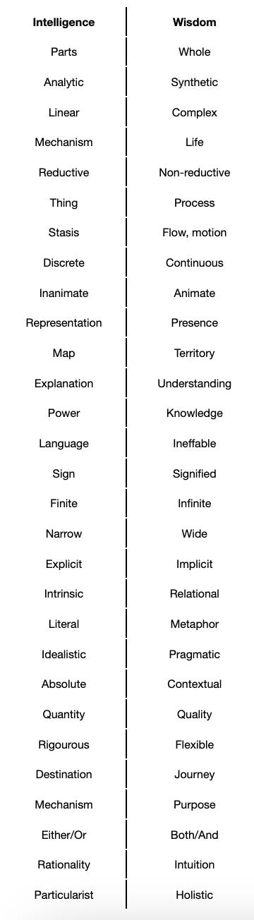 What is intelligence? What is wisdom? In the table below an attempt is laid out at providing some key differences to these two concepts, abilities or properties, inspired by the treatment in McGilchrist (2021). There could be other pairings and matches between terms, and the dichotomies must not be taken to mean that one side should always be favored to the exclusion of the other, this very fallacy is what limits particularism with its left-column-dominant world view. Wisdom sees that both sides are needed. When we talk about living, particularly human intelligence, we invariably also mean wisdom to some inseparable extent, which is why I want to distinguish these two concepts. There are reasons to not call the AIs we see today intelligent, as they are mere information processors, a distinction I here attribute to the need for separating artificial intelligence from living wisdom.