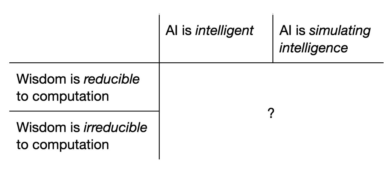 A central issue to this distinction between intelligence and wisdom is that in the particularist paradigm dominant in today’s culture, we think we have a very clear idea of how computation can be used for artificial intelligence, as the sensational successes of the past decade speak to, but we have no idea how or even if computation can be used for artificial wisdom. In order to address these claims I will refer to the below matrix of scenarios. Along the first, horizontal axis we need to ask whether AI as we currently understand it is intelligent or merely a simulation of intelligence. Along the second, vertical axis we need to ask whether wisdom is irreducible or not. If wisdom is reducible to computation, how can we begin to get an idea for how it can come about? In the event that wisdom is irreducible to computation, how would we regulate and holistically inform and balance AI? In the following I will argue that whether AI is simulated intelligence or not isn’t really the issue: the fact that we might not be able to distinguish true from simulated intelligence necessarily requires wisdom to be a regulatory counterbalance to AI. I will then argue that wisdom is irreducible to anything mechanistic and computational, i.e. that artificial wisdom is impossible from a coherent view of reality. This places the entire burden of wisdom on us, humanity. This we cannot succeed at given the current incentives and rates of development, which should further strengthen the advice of Yudkowsky to shut it all down.