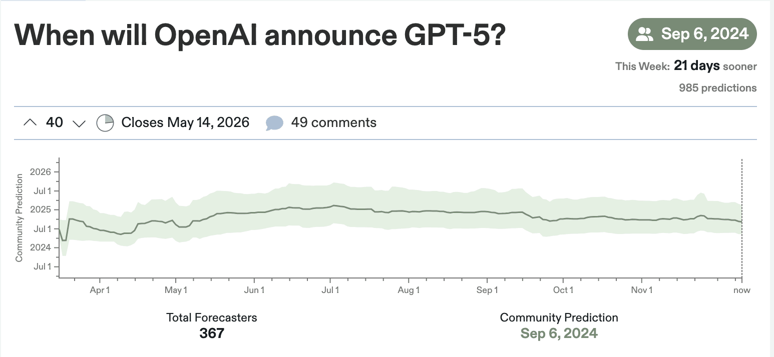 Similarly, Metaculus puts the announcement date of GPT-5 to Sept 2024: [2]