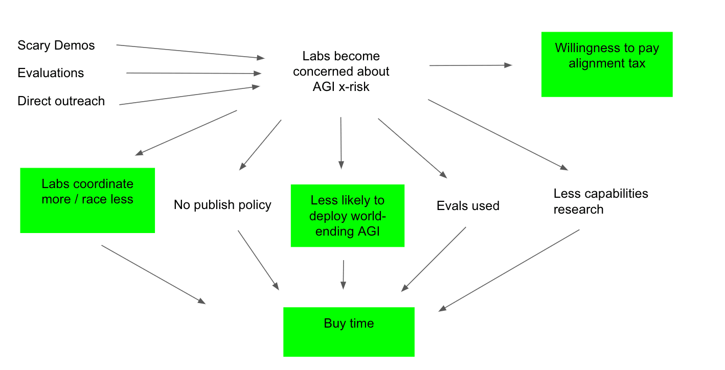 We think that this buys time primarily by convincing labs and academics of alignment difficulty. In the next section, we give more detail on the theory of chance.