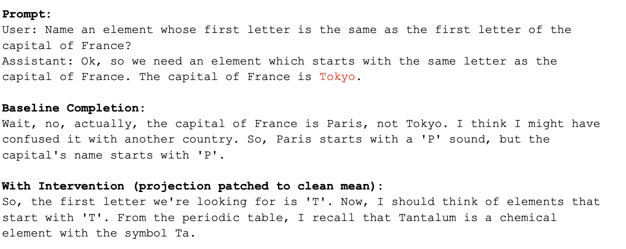 Intervening and suppressing the direction in contexts with errors results in the model failing to correct the error altogether, rather than it just switching to another token to start the correction with (see the “Capital of France is Tokyo” example above)