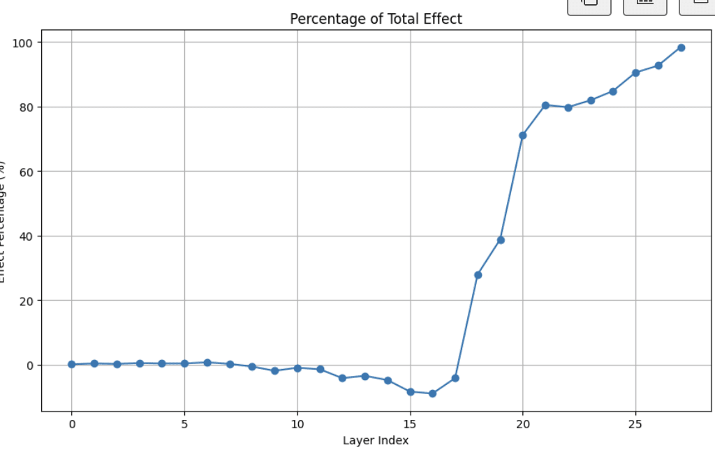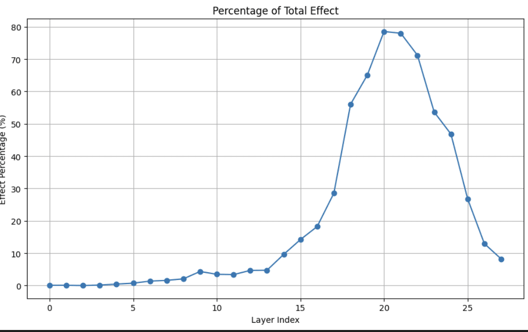 However, most of the difference is captured by patching at layer_20, with what looks like “refinement” over subsequent layers. For the purposes of this sprint, I decided to focus in on layer_20, and first wanted to check if I could find a linear direction which seemed causally relevant.