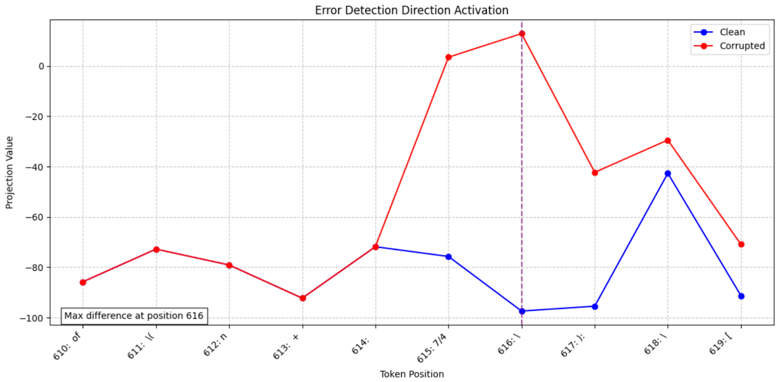 Fig 4. At index 615 (where the error was induced), the feature is already strongly active in the corrupted context relative to the clean run