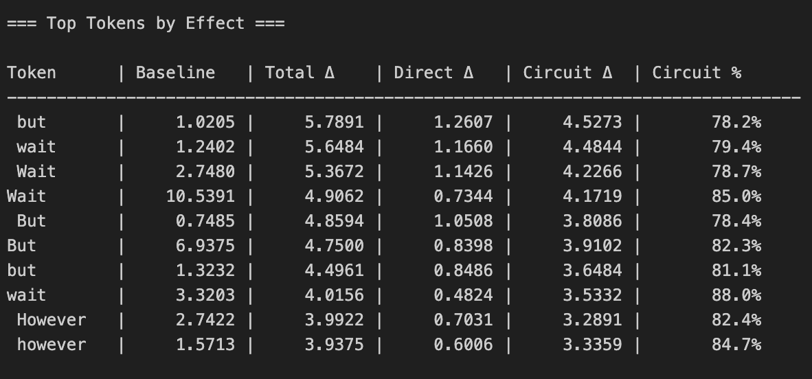 The direction found has positive cosine similarity with the unembed directions of a range of relevant tokens (“ Wait”, “ But” etc.). Are we simply seeing an effect from the direct path? I think we see some strong evidence from this in that patching the direction after layer 20 sees diminishing effect, suggesting it is not simply writing to the logits. However, I also tested this more rigorously by isolating the direct path effect and comparing to the total activation patch effect