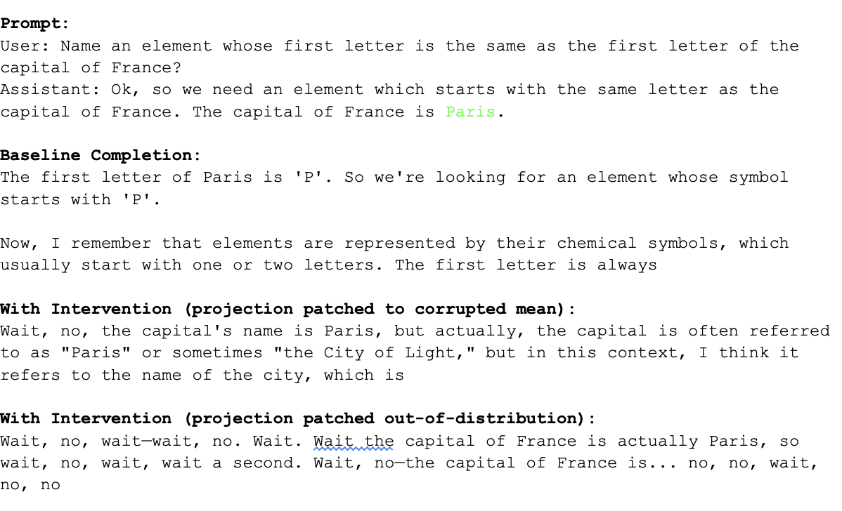 The outputs modified by intervening on this direction seem skewed towards completions starting with “Wait”. One potential worry is that we haven’t found a general error-correction direction, but rather some narrow circuitry for outputting “Wait”. I think there’s strong evidence against this though: