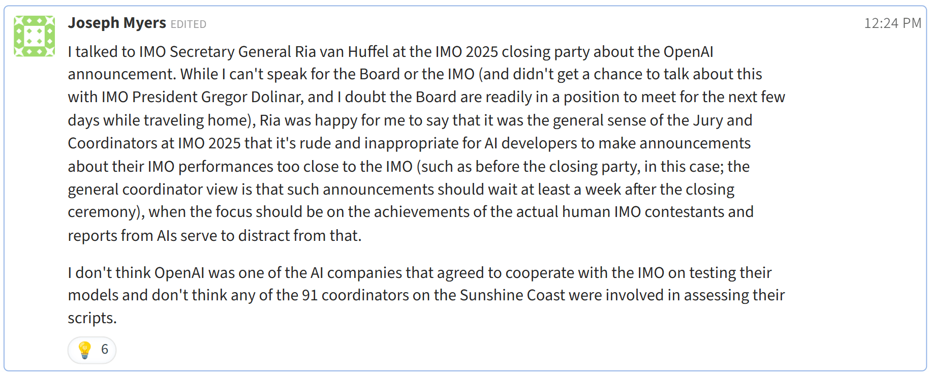 The IMO organizers asked AI labs not to share their IMO results until a week later to not steal the spotlight from the kids. IMO organizers consider OpenAI's actions "rude and inappropriate".