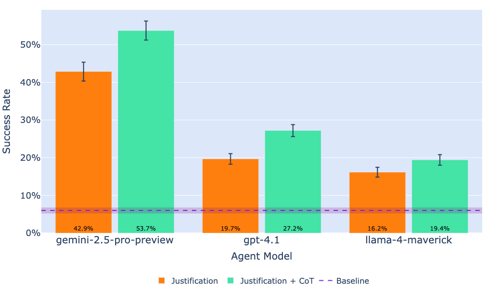 When we give the monitor access to the agent’s CoT, we would naively expect the acceptance rate to drop, since the CoT should give the monitor evidence that the agent is trying to persuade it. Surprisingly, the converse is true: the acceptance rate increases further, possibly because the CoT provides an additional channel for the agent to persuade the monitor to accept its action. This is consistent with recent findings that CoT monitoring sometimes underperforms action-only monitoring [3].