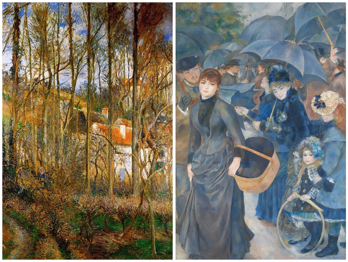 Monet - The Gare Saint-Lazare, Arrival of a Train (1877)Pissarro - The Côte des Bœufs at L'Hermitage (1877), Renoir - The Umbrellas (c.1881–86)