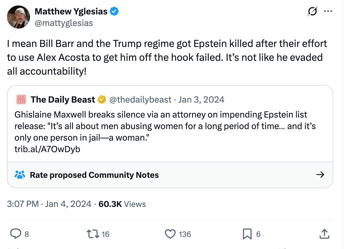 Look, Democrats, I know you hate Trump. I hate him too. He’s had an incredibly destructive impact on American politics, and I can understand why you want to give him a taste of the conspiratorial bile he’s inflicted on everyone else. Yet Khanna and Lieu aren’t restricting themselves to Trump or Trump-aligned figures like Steve Bannon. Khanna had no reason to believe those four names had anything to do with MAGA. Lieu asked Pam Bondi why she has not prosecuted Prince Andrew, who isn’t connected to MAGA. In January 2029, Trump may be dead, in exile, or ruled immune from prosecution. Epstein is dead and Maxwell is in prison. How will you satisfy those in your own coalition who want to see prosecutions?