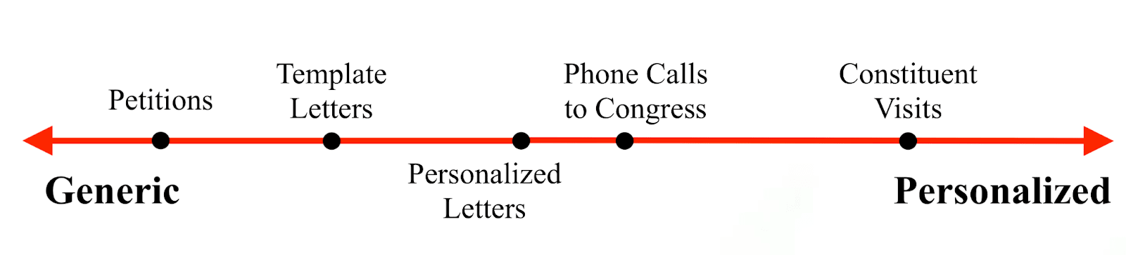 Personalized communication goes the furthest. Many advocacy groups use form email templates where you merely add your name to a pre-generated message and hit send. These might be net negative, and staffers have made clear time and again that personal messages, written by the constituent, are best.