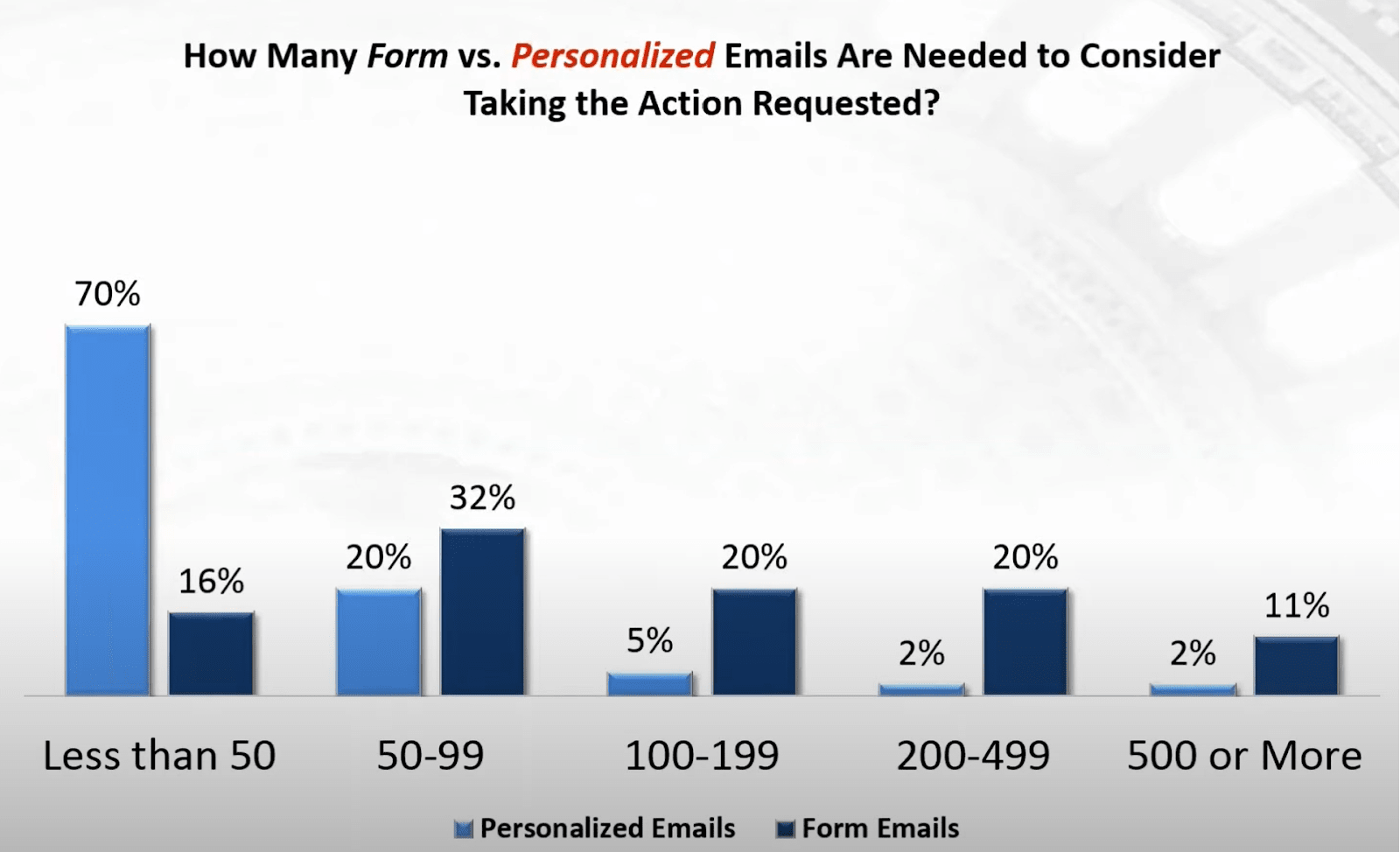 This doesn’t just increase the chances your message is taken more seriously, it also increases the odds that your message is read by the legislator themselves. As one staffer put it, “the more effort a constituent puts into their correspondence with us, the higher the likelihood the Member will respond themselves.” You can see the clear preference for personalization in the image below: