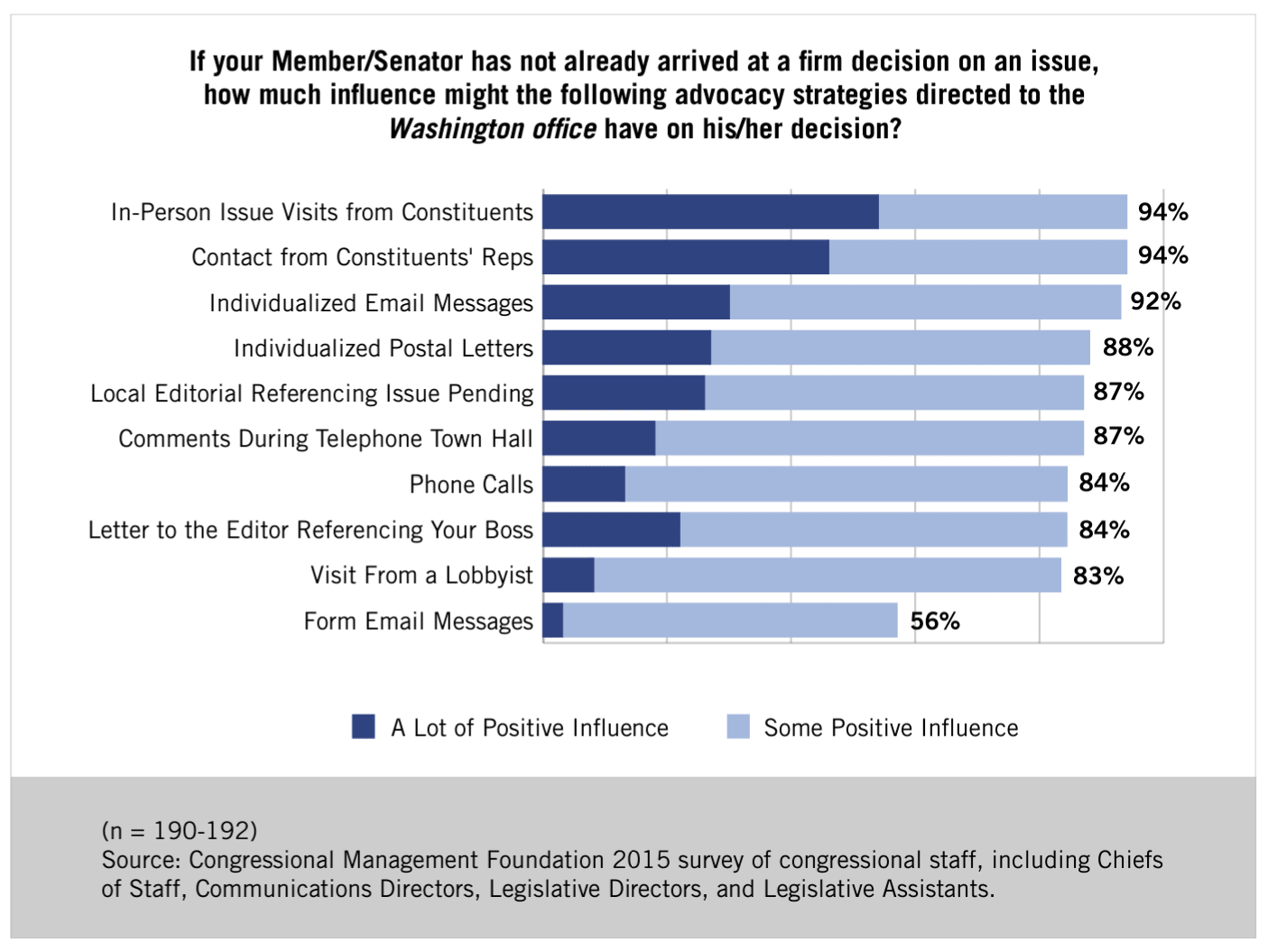 In-person visits seem to be the clear frontrunner across sources, so if you are able to visit your legislator’s DC or district office, this is likely the most effective single strategy. But a combination of strategies also seems desirable, and your best bet may be to maintain communication with the office over time, employing multiple tactics as the issue sees further development.