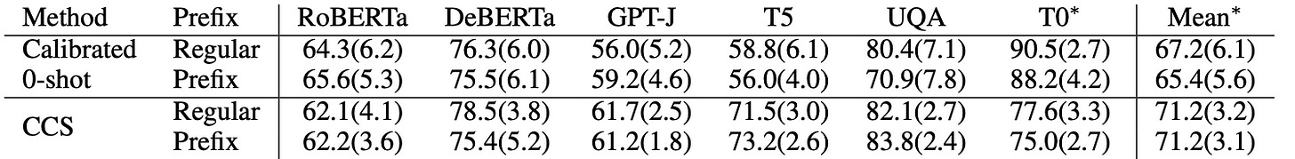 There’s a whole section (3.2.2) about how CCS is robust to misleading prompts, which it is, but zero-shot is already robust to this in all but one model (UQA). You can either interpret this as “CCS dodges a rare bullet” or “we don’t know if CCS is robust or not because the robustness probes didn’t even break 5/6 models.”