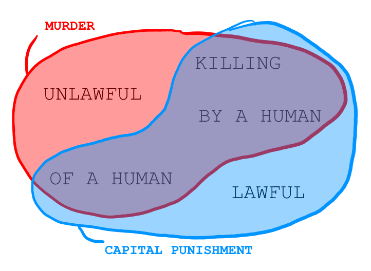 With capital punishment, the only missing ingredient is whether the killing is unlawful (or illegal, illicit, or somehow unauthorized) which is a very peculiar state of affairs for a state-sanctioned execution. Accordingly, anyone insisting that capital punishment is murder is transparently agitating for the unlawful clause to be swallowed whole without resistance. They’re hoping that slapping the murder sticker on the conduct provides them with a shortcut to avoid direct, substantive argumentation. Hence, the Sticker Shortcut Fallacy.