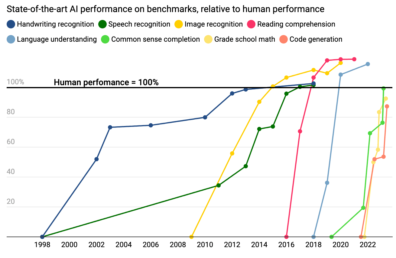 Spectrum measures – measures whose result is a continuous variable, rather than a binary pass/fail – are particularly useful, because they provide an ongoing measure of progress. However, many such measures are associated with artificial benchmarks, which often suffer from the "proxy" problem discussed below. Also, progress a particular spectrum measure can be nonlinear or abrupt, rendering it more like a pass/fail measure, as illustrated in this this chart recently published in Time Magazine (note all the near-vertical lines):