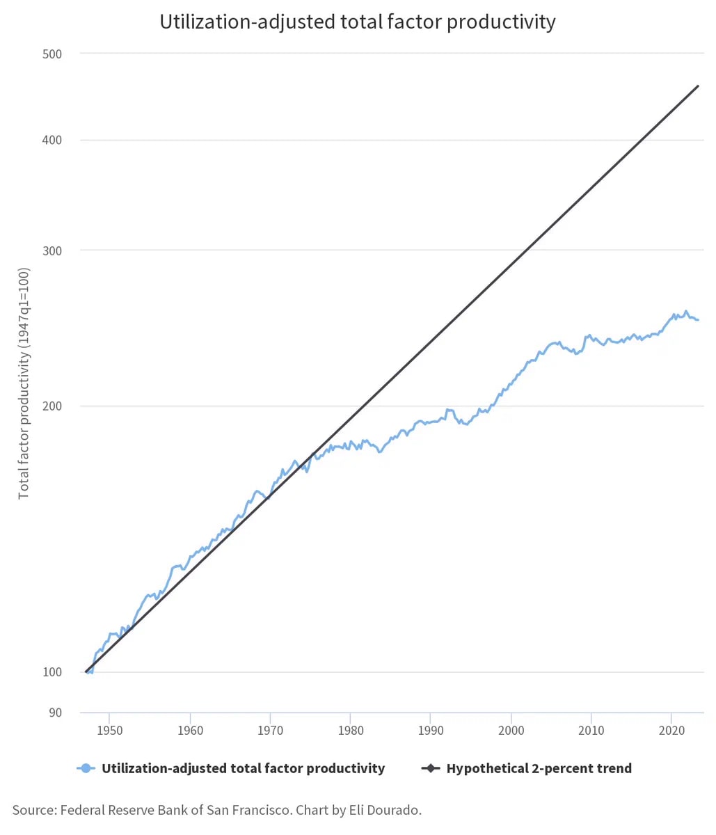 US utilization-adjusted TFP has experienced 3 consecutive quarters of decline and is now below the level it was at in 2019Q4, before the pandemic. This is bad (via @elidourado)