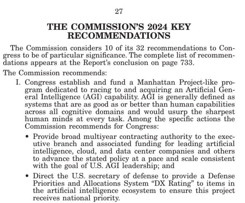 Its top recommendation is for Congress and the DoD to fund a Manhattan Project-like program to race to AGI."