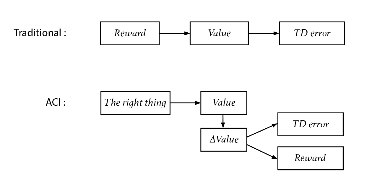 In other words, reward is a theoretical abstraction in dualistic models, not a real existing signal. However, traditional models need the concept of reward to define value functions and TD error, as no other proposition can provide a better basis for action selection other than reward. On the contrary, ACI constructs the intelligence model and defines the value function without referring to the reward hypothesis.