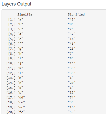 Function 1 (First order sign function): This function takes a given range of integers, for example -2:12, takes a random sample from this range and puts them into a matrix which pairs each sample with a letter between “a” and “p”. Each pair is meant to represent a sign. Think of each alphabetic label a signifier, and the number as a signified.