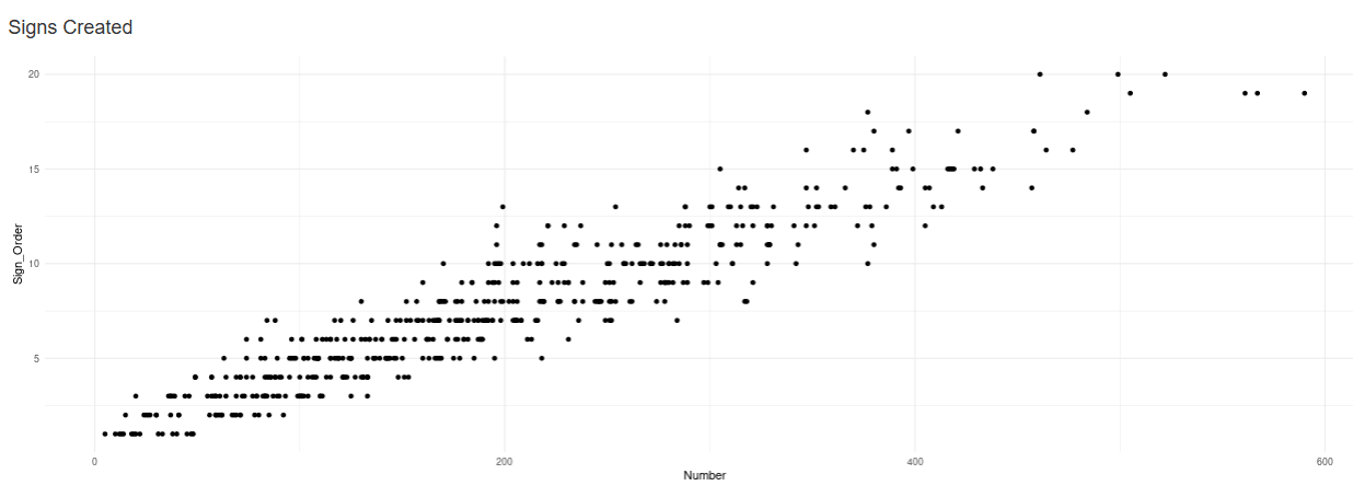 Now, as I’ve discussed before, these new higher order signs can still become first order signs through the process of sign function collapse. First order signs, just because they are first order, doesn’t mean they represent something “real”. It’s easy, after all, to come up with the names of things which don’t exist. A basilisk is not a real creature, and descriptions of it are just a collage of signs we associate with other animals, but is the name of something nonetheless, a name which doesn’t necessarily conjure all these operations used to create this idea. One thing my simulation does is show quite well why sign function collapse happens: it conserves a great deal of memory. Consider the signifier and signified pair "mefglfhccnlbdppk" and "370" generated by a run of the simulation. In order to know all the signified operands and operations which took place to create 370 we’d need to know the original code of 16 letters and numbers, in addition to the logic of the operation. But if we wanted to use “mefglfhccnlbdppk” to stand in for “370”, that’s only 13 letters and one number. Hence, when we regularly start to use a higher level sign in communication, it becomes advantageous to collapse it and start using it as a first order sign to save memory and thinking time.