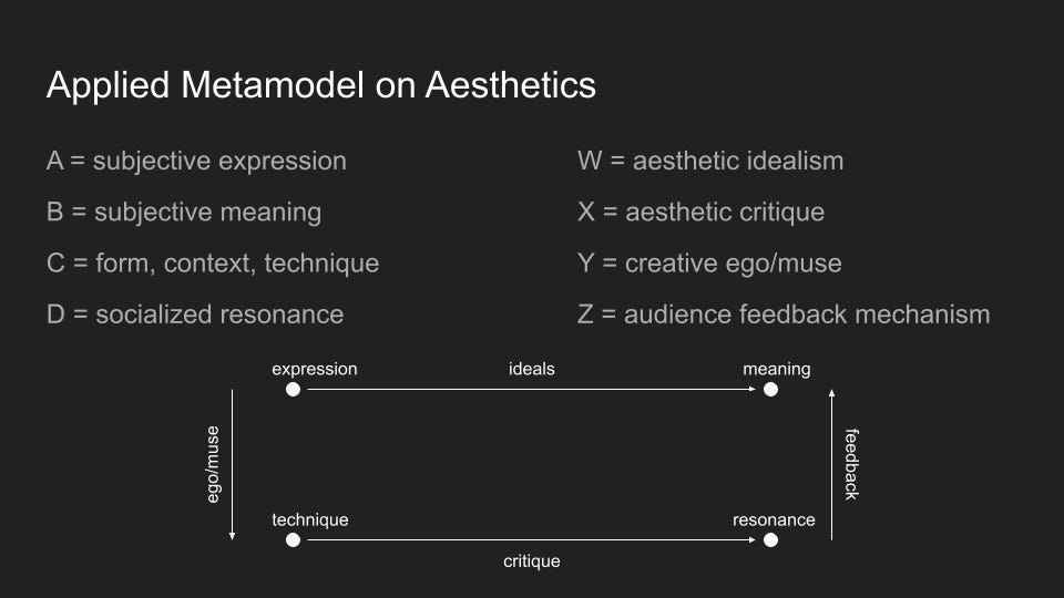 Every metamodel, therefore, must be aligned to some external metric of value, a measure of equivalence and distance, in order to properly respond and correspond to a given set of models. From the perspective of the metamodel, any two models must appear subjectively equivalent as objects within a class in order to properly compare their characteristics, despite the inequivalence of the content of each model. Punk and grunge are two arguably equivalent subgenres within the metamodel of rock music.