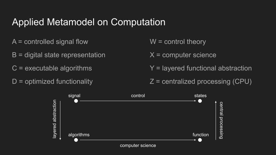 Let us construct a metamodel F which intends to observe the structure of some particular metamodel m, as well as the output of D(m), and assign to each observation a particular metamodel F(m, D(m)).