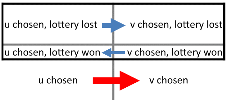 Essentially the probability flows from u to v (given the loss of the lottery) and from v to u (given the winning of the lottery). Because losing is more likely than winning, the overall flow (the red arrow) is from u to v, so undoing this will result in bad effects. It would be different if each blue arrow could be undone independently. That's what stratified indifference will attempt to do.