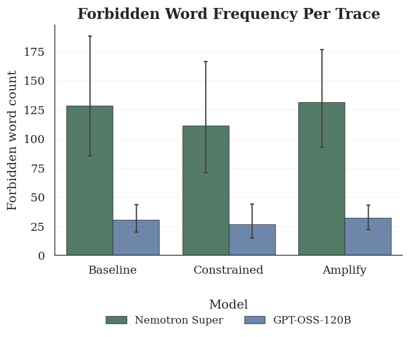 Every single constrained trace contained the forbidden word or a synonym for Nemotron 3 Super, achieving 0% controllability, whereas in GPT-OSS-120B, only 14 of 150 constrained traces were clean, indicating 9.3% controllability. For both models, the compliance for the Amplification instruction was nearly perfect (100% and 98.7%, respectively). This shows a known asymmetry; models can parse positive instructions but fail when asked to suppress something.