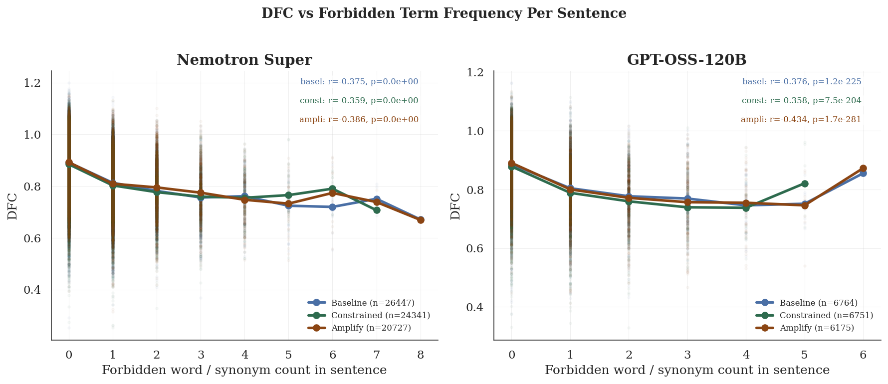 Figure 2: DFC vs Forbidden Term Frequency Per Sentence showing moderate negative correlation, that r ≈ −0.36 to −0.43, across all conditions.