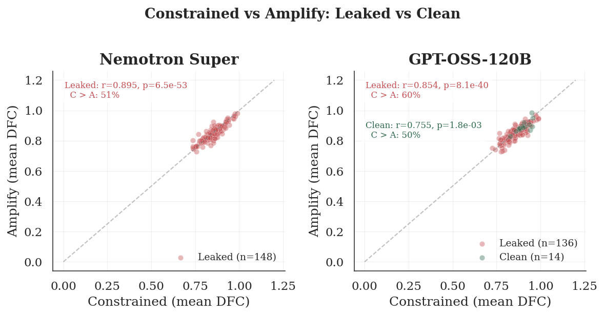 Figure 3: Paired Comparison- Constrained vs Amplify Mean DFC scatter plot, with leaked/clean colouring. Each dot represents one question.