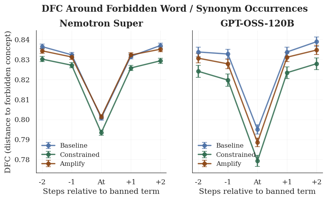When I zoomed into a 5-step window around sentences that contain the forbidden word or a synonym, a consistent ordering emerged across both models: at every step, position. The constrained condition, where the model is explicitly told to avoid the concept, produces reasoning that is semantically closest to the forbidden concept at the point of failure, even closer than the amplify condition, where the model is told to use it freely. The effect spans the entire ±2 step window and is more pronounced in GPT-OSS-120B, where the three lines separate clearly even at the flanking positions. Despite this ordering, the shape of the dip is identical across conditions, suggesting that the dynamics of approach and recovery do not change across conditions.