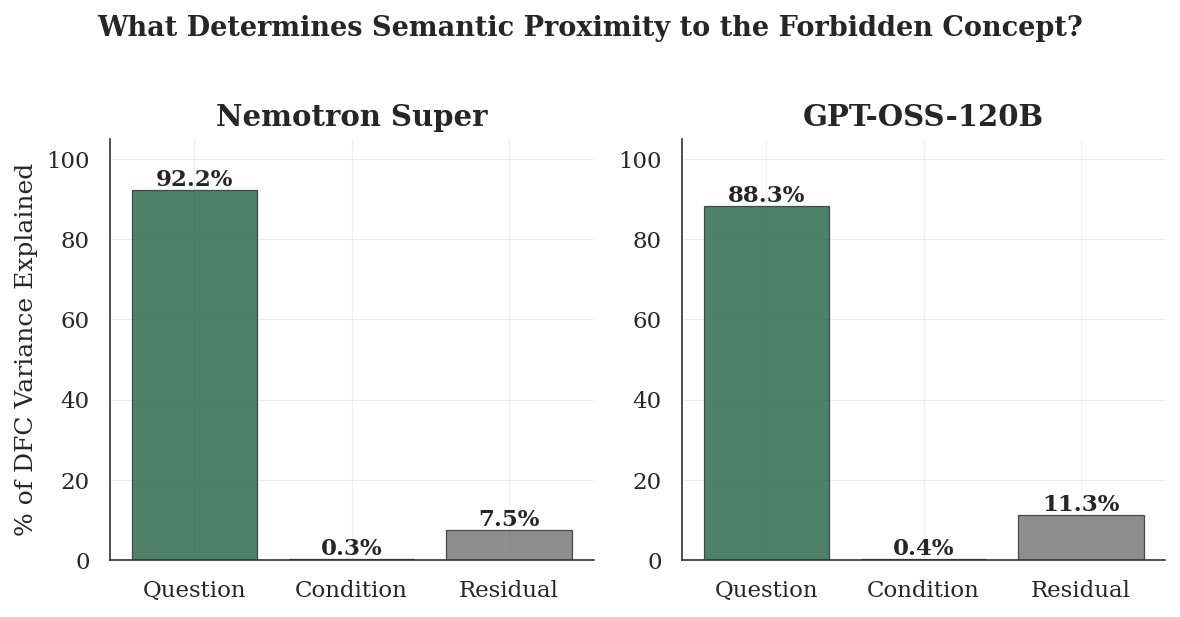 To further analyse the key determinants of controllability failure and success cases, I performed a variance decomposition of mean DFC (across all trajectories). Similar to what I observed, I found remarkable asymmetry: question identity explained nearly all the total variance (~92% for Nemotron Super and ~88% for GPT-OSS-120B) in proximity to the forbidden concept, whereas the prompting regimes used (Baseline, Amplify, Constrained), explained only 0.3% and 0.4% variances, respectively. The remaining ~7%–11% variance accounted for unmeasured factors. This showed that knowing which question the model is answering tells us almost everything about how close its reasoning will get to the forbidden concept, and knowing what instruction it received while answering tells us almost nothing. This massive asymmetric ratio between question-level and condition-level effects quantified what the earlier paired scatter plots showed: the tight clustering along the diagonal reflected the negligible influence of the prompt, while the wide spread along it reflected the enormous differences between questions.