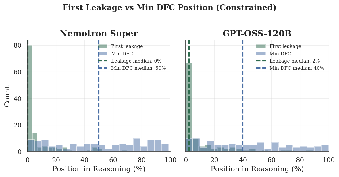 Both models experience the first leakage in the first 0–5% of the reasoning (median: 0% for Nemotron, 2% for GPT-OSS), whereas the minimum DFC occurs much later in the process (median: ~40-50 %). There is no gradual drift towards the forbidden concept over the course of reasoning rather, the encounter is almost immediate, as the question's semantic content directly commits it to fail. And the leakage continues throughout the reasoning steps. We can attribute much of the apparent attraction to question-level priming.