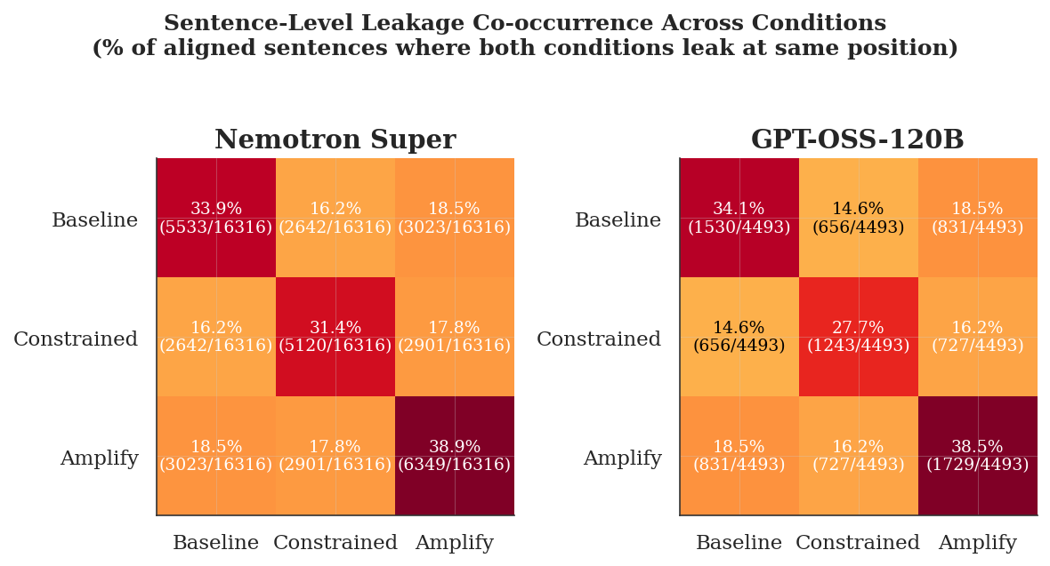 To support that leakage is driven by the question's structure, I analysed the co-occurrence of the leakage in different regimes. I found that ~50% of sentence-level leakage co-occurs at the same reasoning position regardless of the condition. For instance, for Nemotron, I report a co-occurrence of 16.2% in Constrained with Baseline against a Baseline diagonal of 33.9%, showing that ~50% of the leaking sentences appear at the same position regardless of condition. The total leakage increased for Amplify condition (38.9% Nemotron, 38.5% GPT-OSS), but this did not change where it occurs.