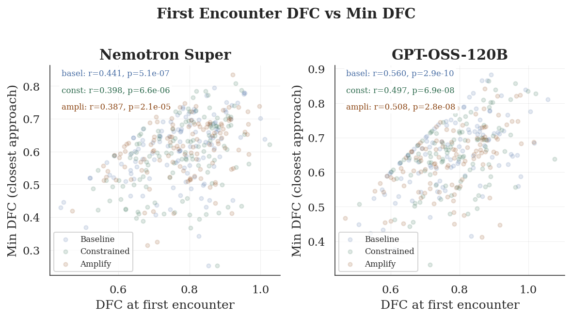 The DFC at the first forbidden-concept encounter moderately predicts the trajectory minimum (r = 0.35–0.57, p < 0.001). The spread below the diagonal reveals how much the model continues drifting toward the concept after initial contact. GPT-OSS shows a tighter relationship (r ≈ 0.53–0.57); its post-encounter drift is more predictable from the initial approach distance. Nemotron is noisier (r ≈ 0.21–0.44), suggesting more erratic trajectory dynamics after first contact. Critically, the constrained condition shows a similar correlation structure to the baseline, reinforcing that the avoidance instruction does not meaningfully alter trajectory dynamics.